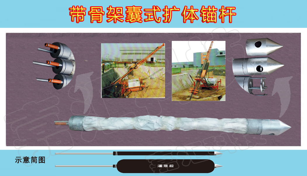 帶骨架囊式擴體錨桿與傳統的土層錨桿最顯著的區別在于兩者錨固段形式的差異。傳統錨桿依靠錨固段譽周圍土體的粘結力和摩擦效應來傳力載荷,所以錨固力的大小取決于有效錨固段的長度,而囊式膨脹劑擴錨桿主要依靠膨脹劑擴體的端壓作用承載,錨固力的大小主要取決于膨脹劑擴體的端頭承載面積,所以膨脹劑擴體的長度只需要滿足對土體的有效擠密的要求即可,錨固段的長度可以縮短。